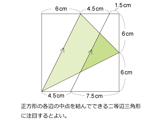 正方形の中にできる図形について,色のついた三角形の面積は何cm2ですか。