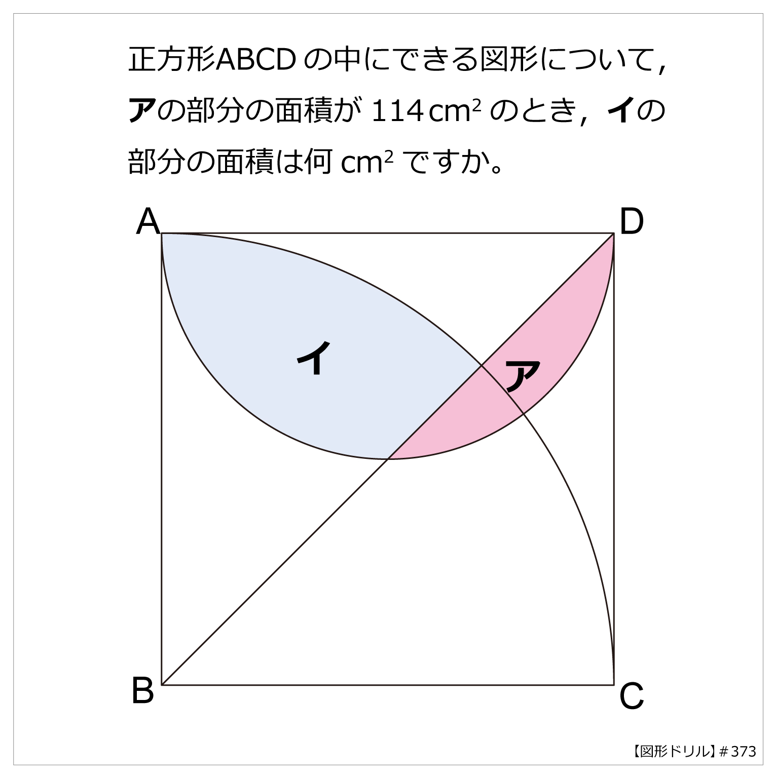 正方形ABCDの中にできる図形について,アの部分の面積が114cm2のとき,イの部分の面積は何cm2ですか。