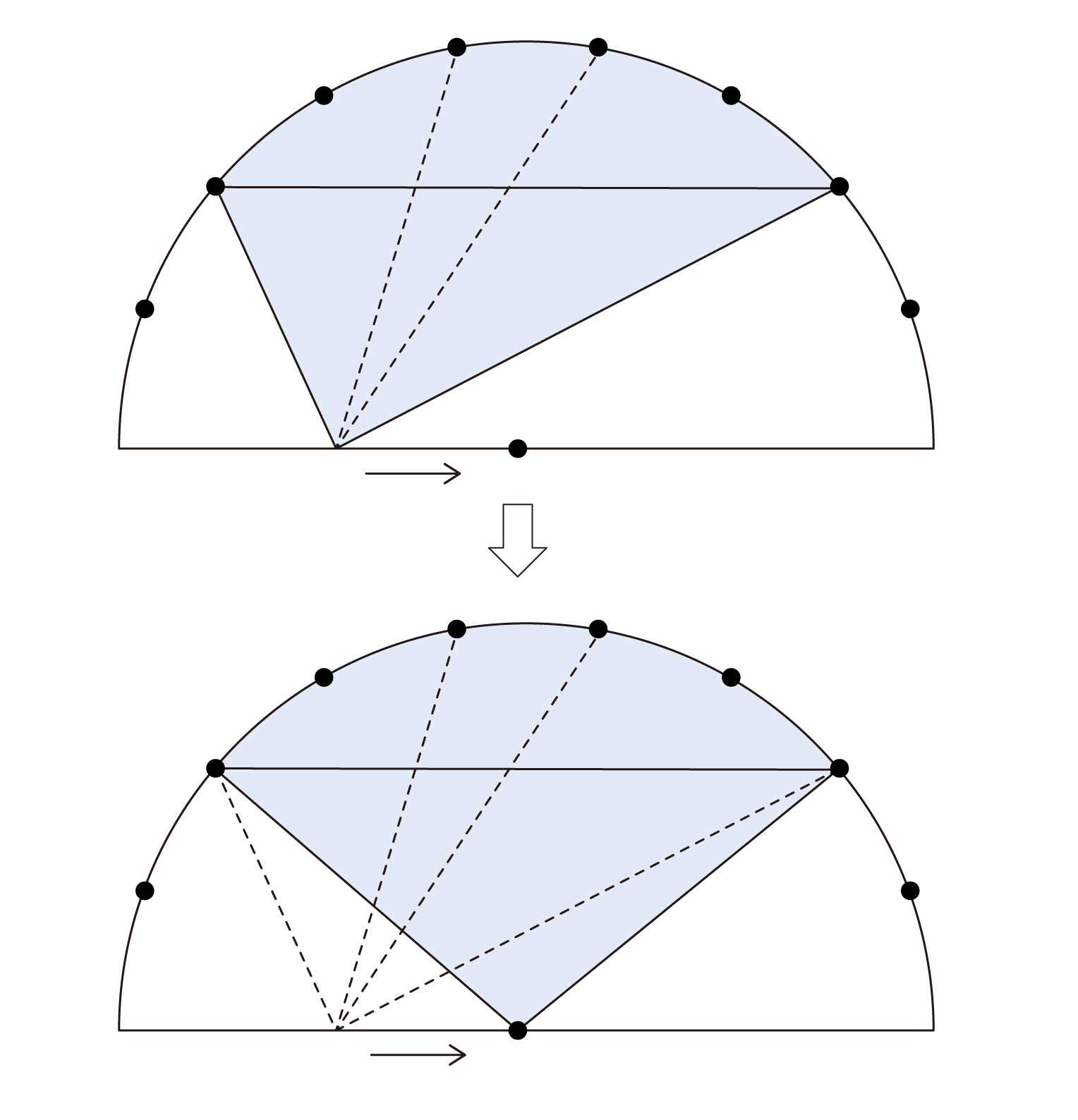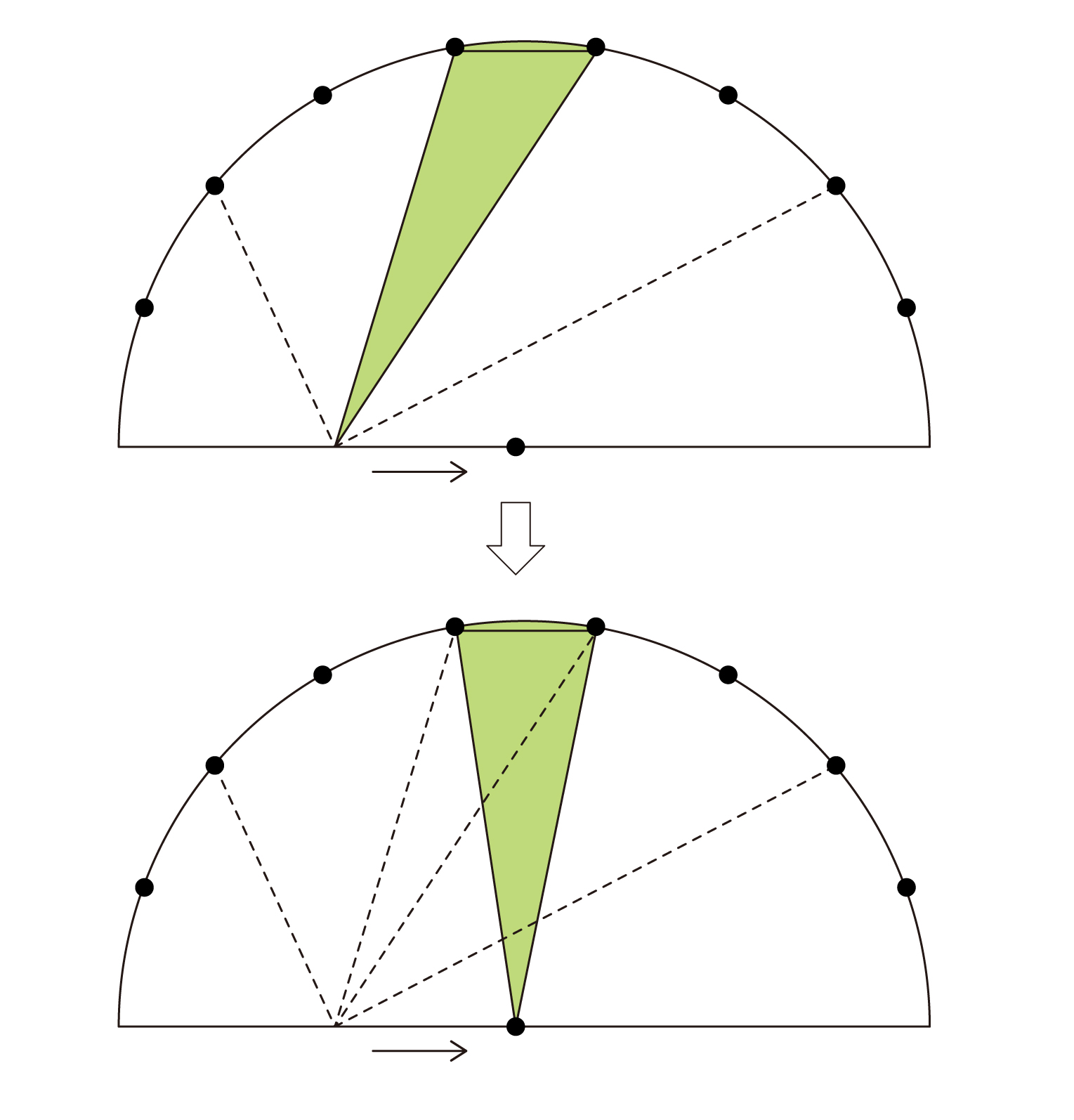 2つの図形をそれぞれ等積変形するとおうぎ形になります。