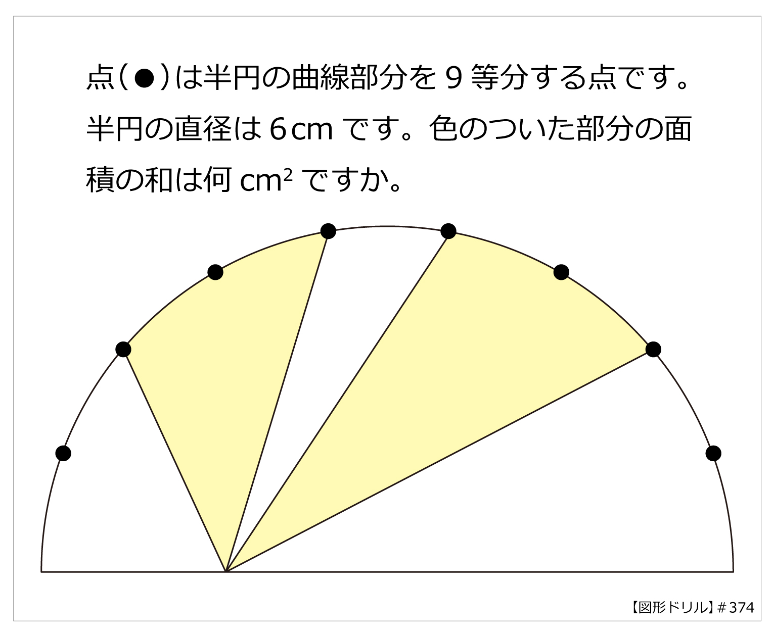 点(●)は半円の曲線部分を9等分する点です。半円の直径は6cmです。色のついた部分の面積の和は何cm2ですか。