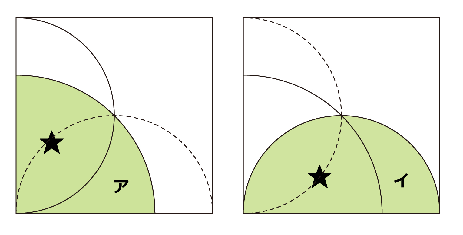 一辺が8cmの正方形に半円とおうぎ形を入れた図形があります。アの部分とイの部分の面積の差は何cm2ですか。