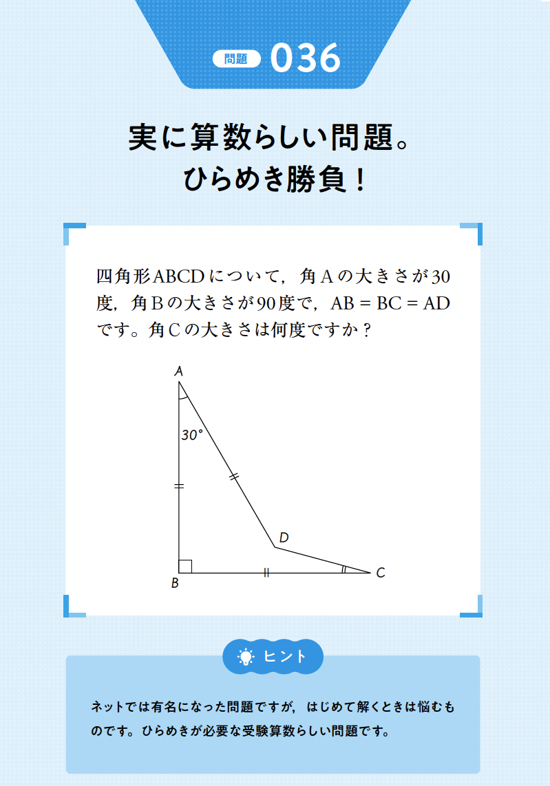 四角形ABCDについて,角A=30度,角B=90度で,AB=BC=ADです。角Cの大きさは何度ですか。