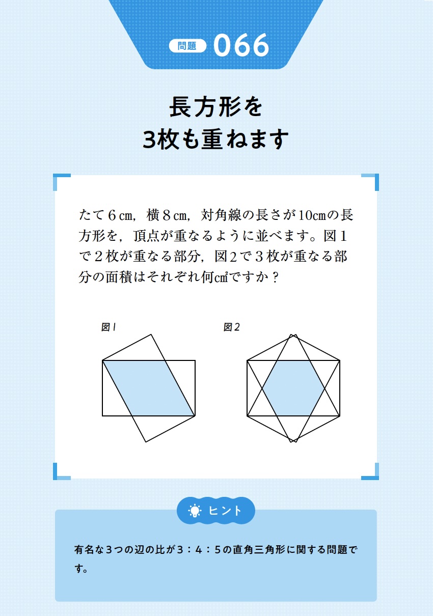 たて6 cm,横8 cm,対角線の長さが10 cmの長方形を,頂点が重なるように並べます。(図1)で2枚が重なる部分の面積は□cm2,(図2)で3枚が重なる部分の面積は□cm2です。