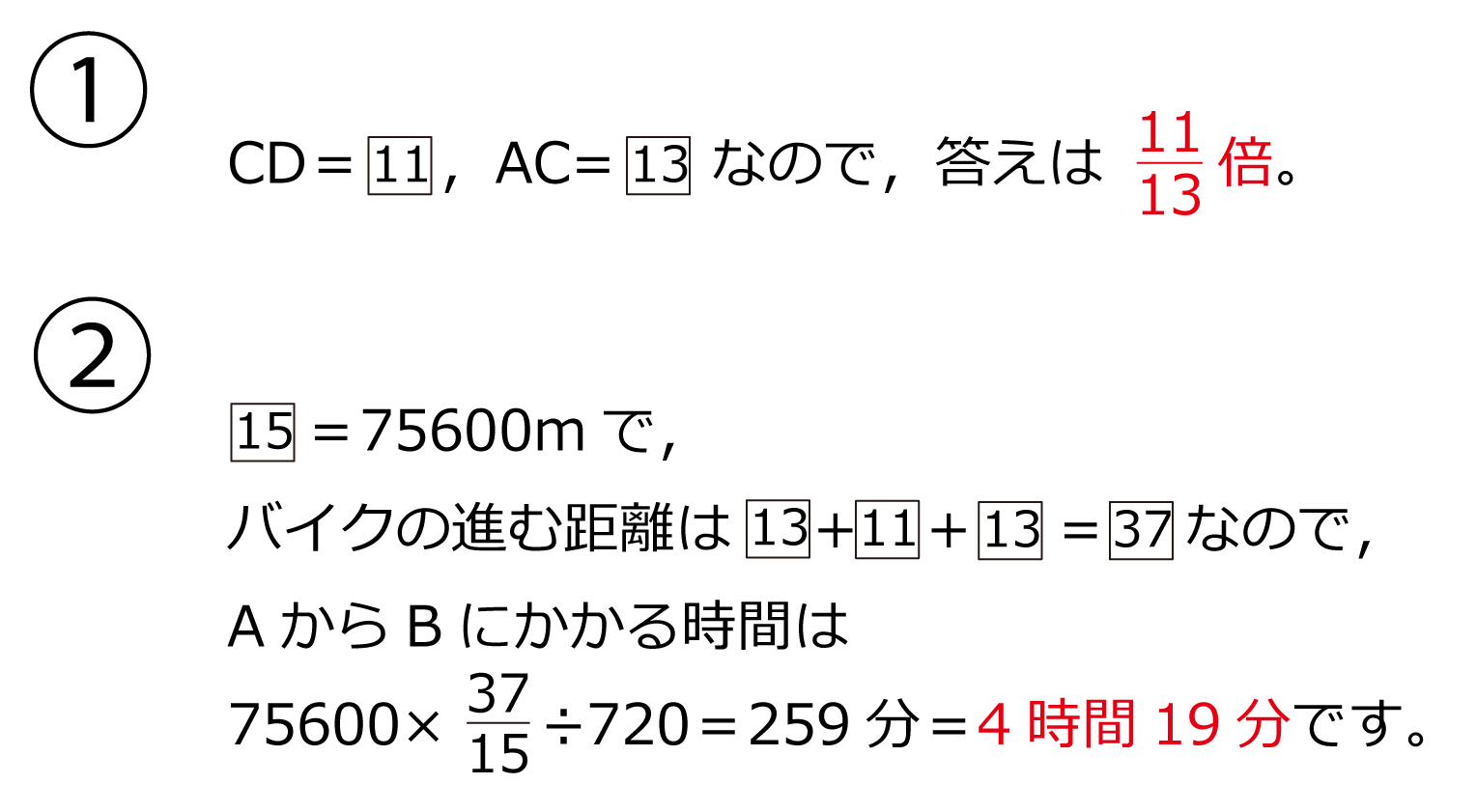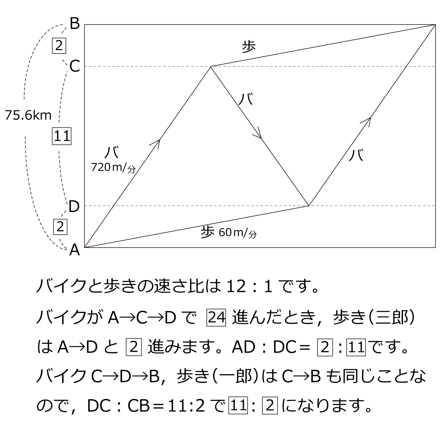 地点Aと地点Bは75.6kmだけ離れていて,地点Aと地点Bを結ぶ1本の道の途中に2つの地点C,Dがあります。一郎さん,次郎さん,三郎さんの3人は,地点Aを同時に出発し,1台の2人乗りバイクを利用して次のように移動して,地点Bに同時に到着しました。一郎さんと次郎さんは地点Aから地点Cまでバイクで移動したのち,一郎さんはバイクから降りて地点Bに向かって歩き,次郎さんはバイクに乗ったまま地点Aに向かって引き返しました。三郎さんは地点Aから地点Bに向かって歩き,次郎さんが運転するバイクに地点Dで乗ったのち,次郎さんとバイクで地点Bへ向かいました。一郎さんと三郎さんの歩く速さは分速60mで,バイクの走る速さは分速720mです。バイクの乗り降りにかかる時間は考えないものとします。地点Cと地点Dの間の距離は,地点Aと地点Cの間の距離の□倍です。また,3人が地点Aを出発してから地点Bに到着するまでにかかった時間は□時間□分です。