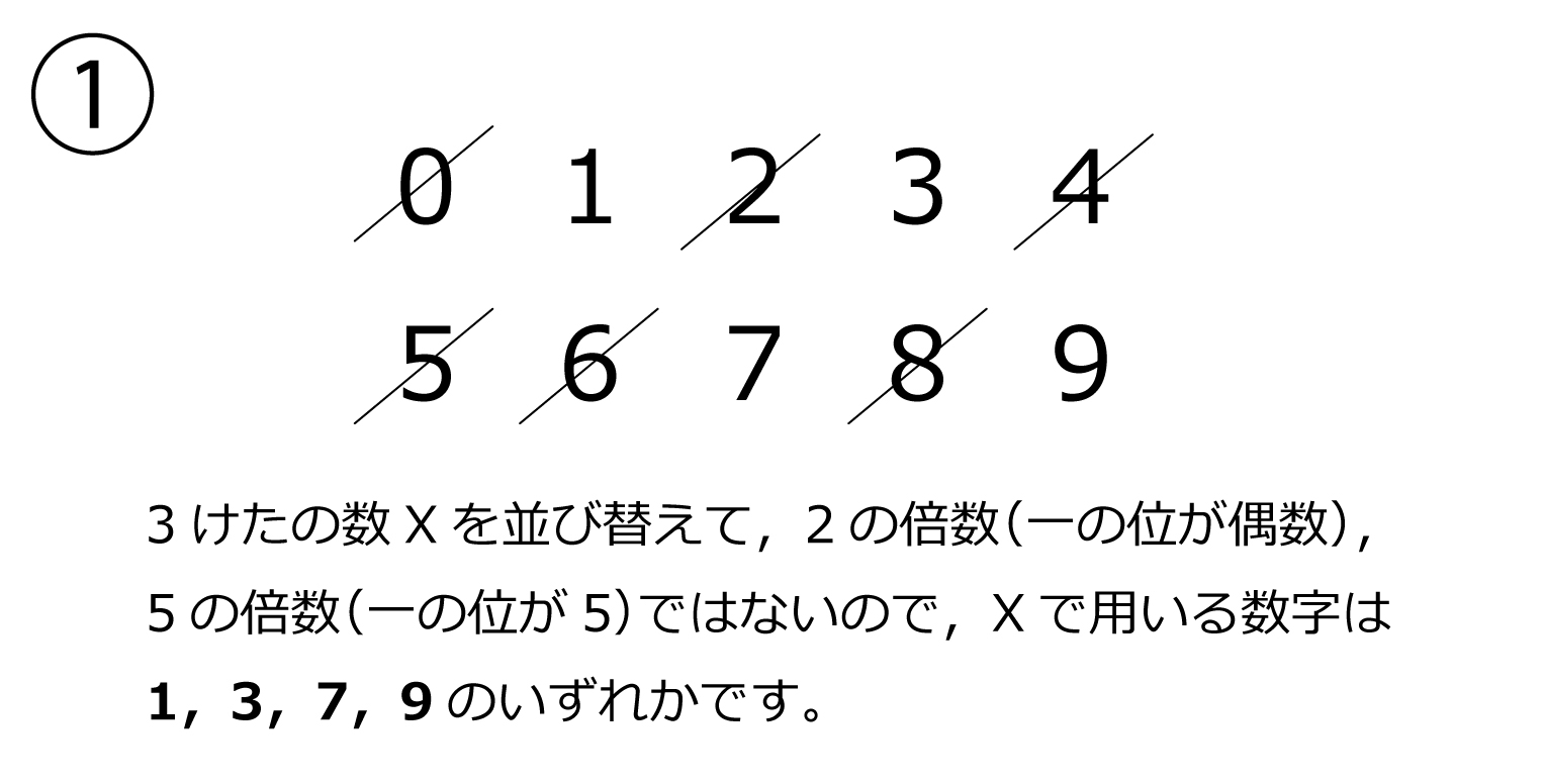 3桁の整数Xについて,次の(条件1),(条件2)を考えます。(条件1)Xは,どの位にも0が使われず,2でも3でも5でも割り切れない。さらに,Xの3つの位の数字をどのように並べ替えても,並べ替えた後の3桁の整数は2でも3でも5でも割り切れない。