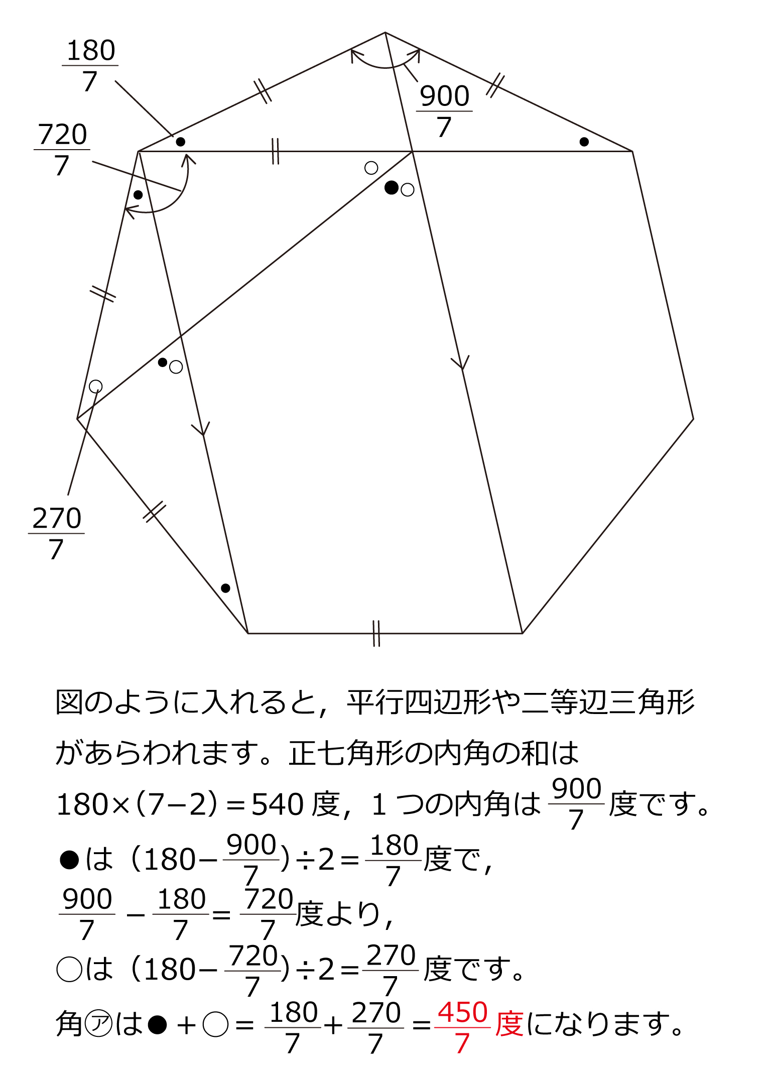 図のように,正七角形の2本の対角線が交わる点と1つの頂点を直線で結びました。角(ア)の大きさは□度です。