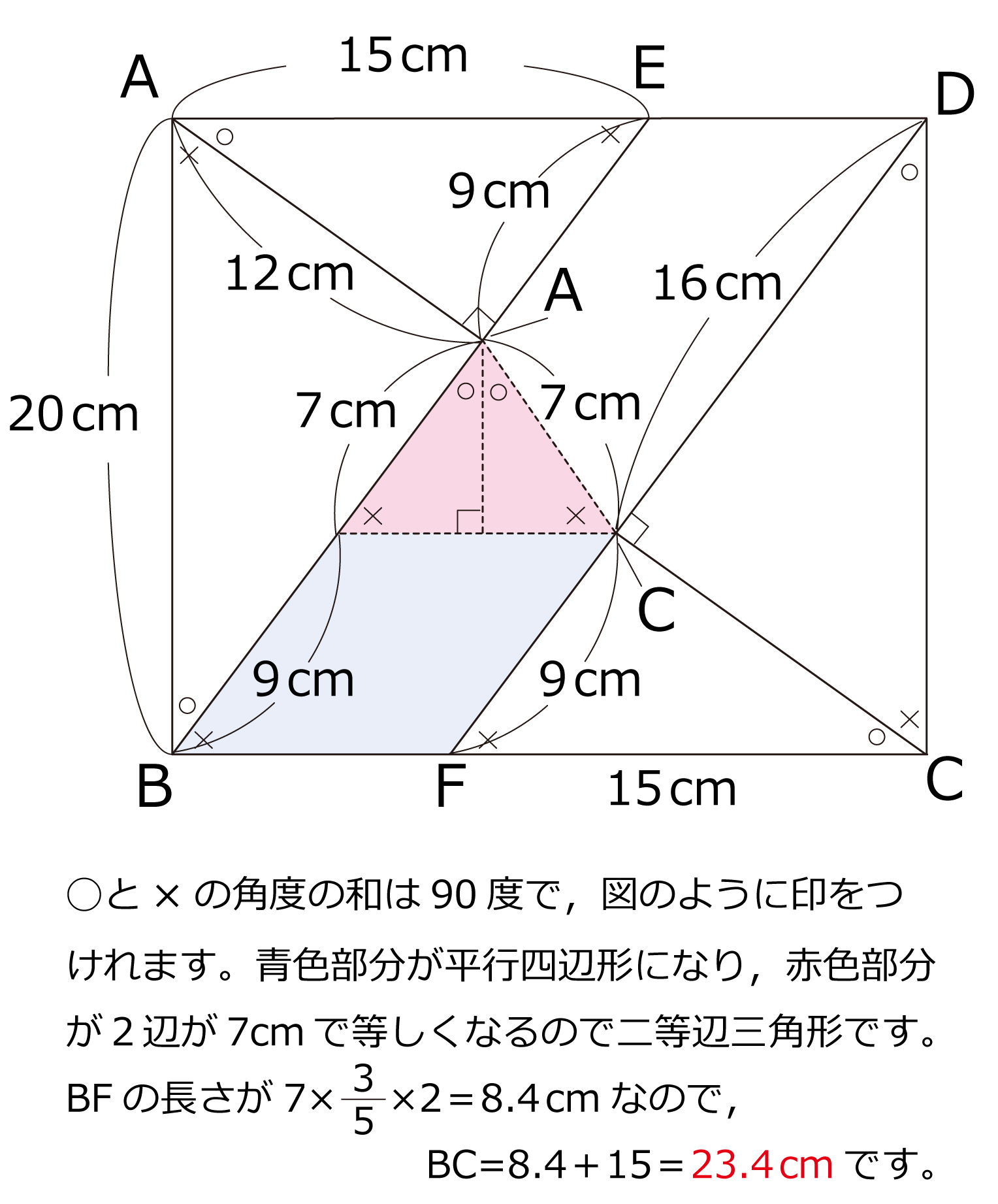 図1のように長方形の紙があり,点Eは辺AD上に,点Fは辺BC上にあります。図2のように直線BE,直線DFを折り目として紙を直角に折り,折った後の紙を直線BEと平行な矢印の方向から見ると図3のように見えます。ただし,図3には直角の印を2ヶ所につけています。図2の2点A,Cを直線で結ぶと,ACの長さは7cmです。このとき,図1の長方形ABCDの辺BCの長さは□cmです。