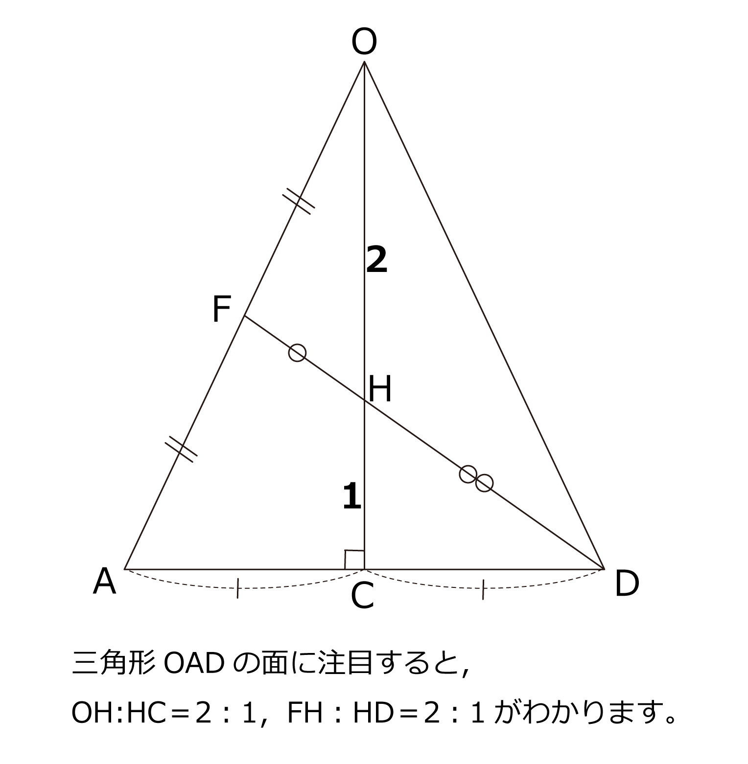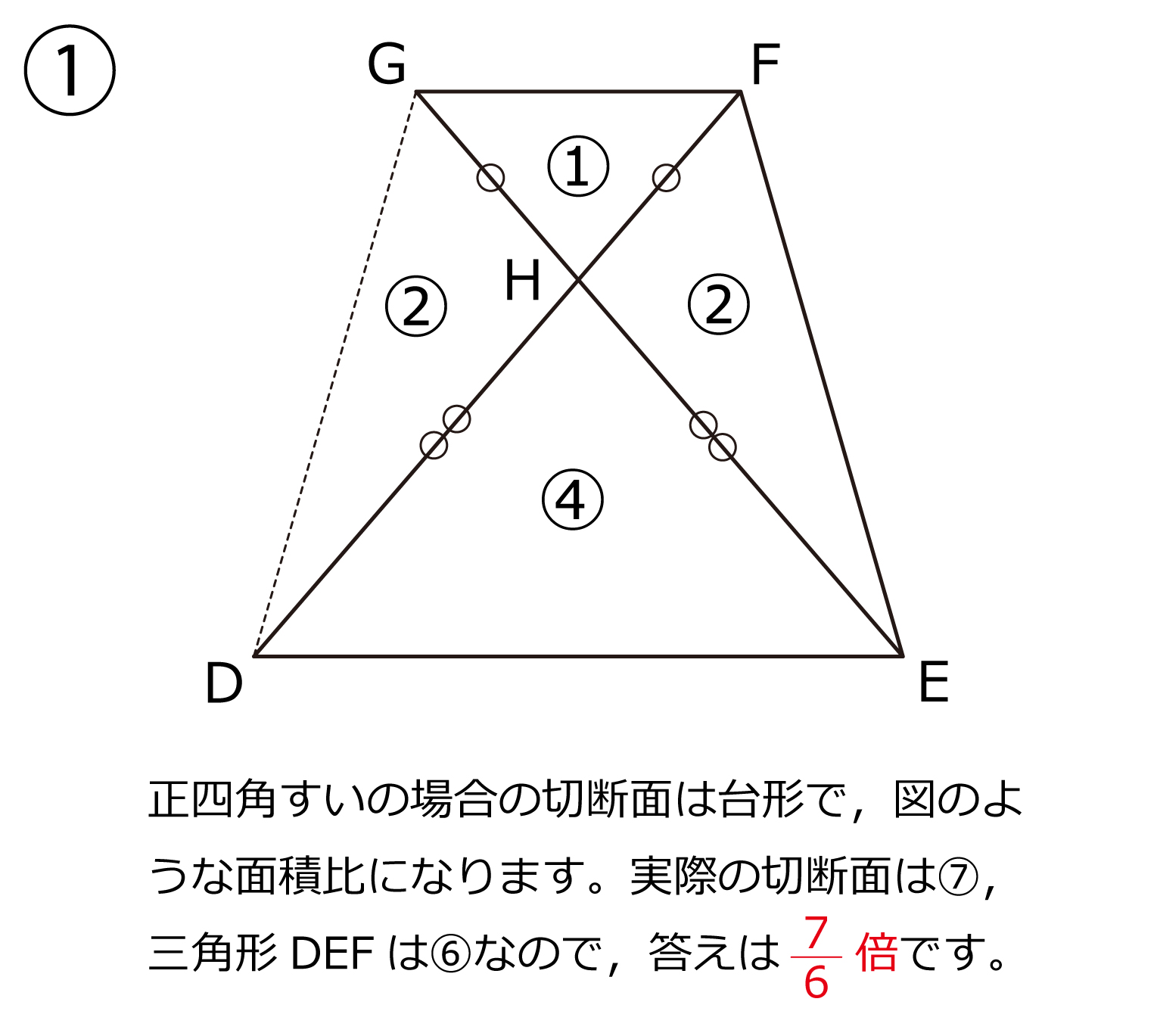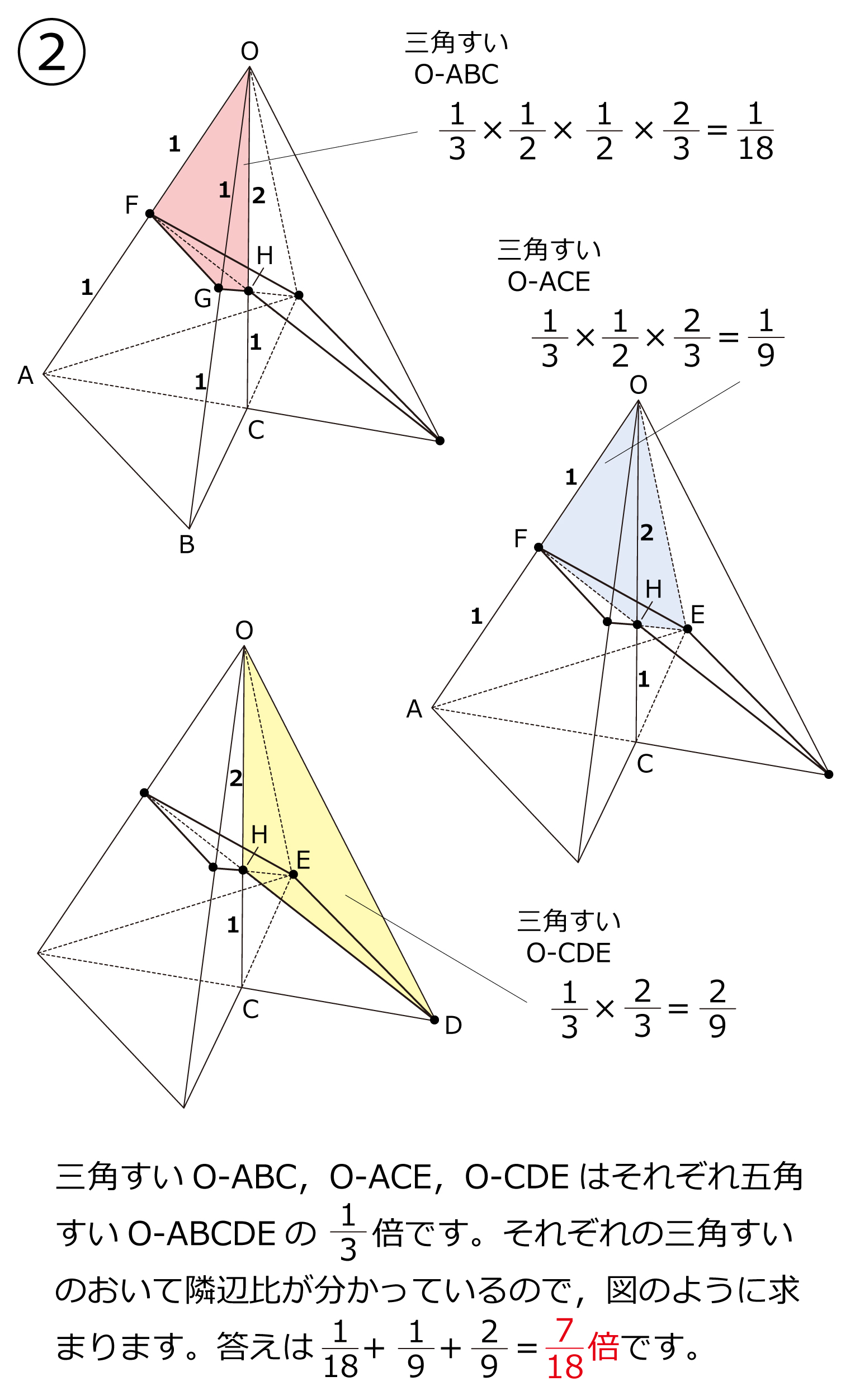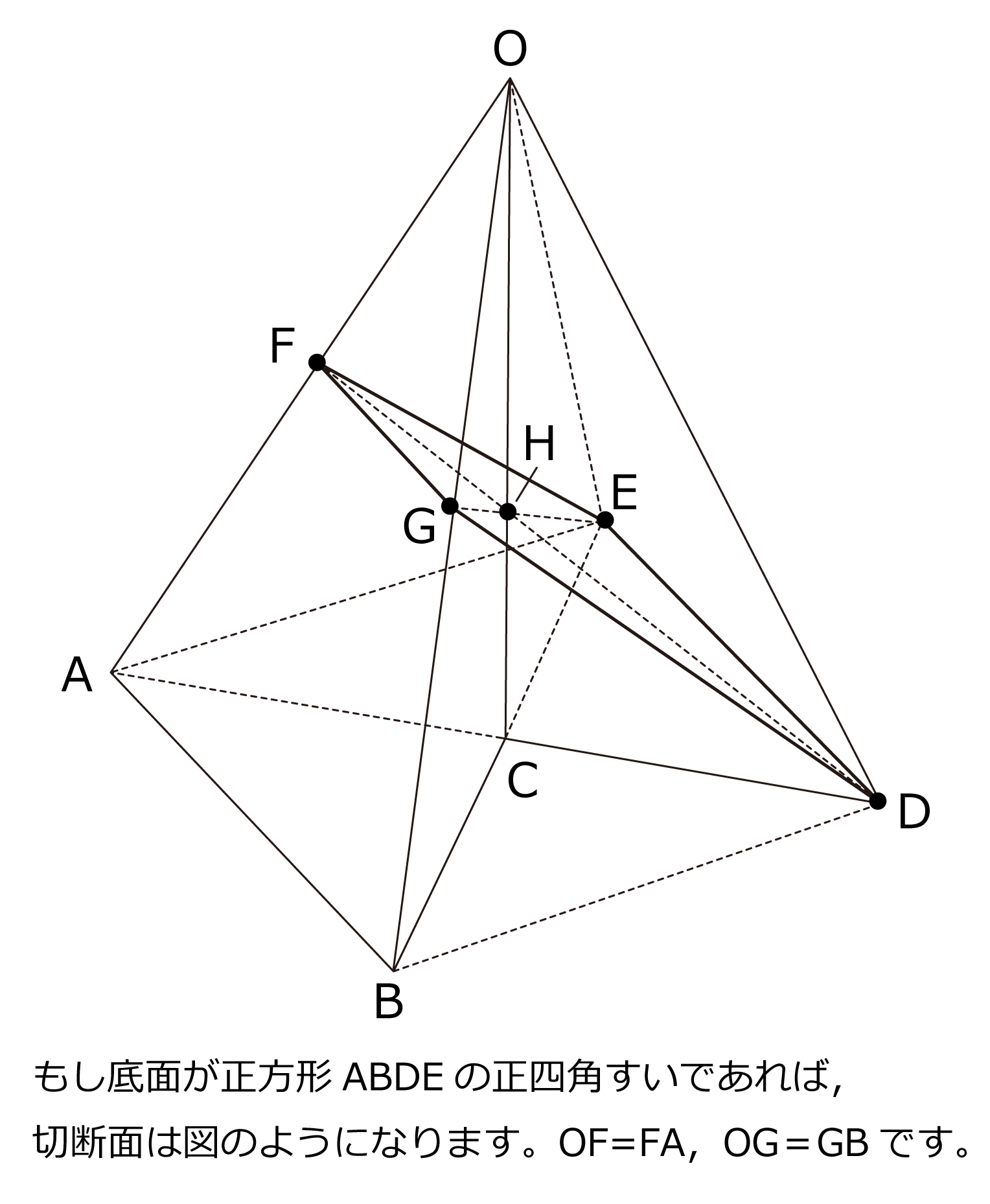 図のように,水平に置かれた五角形ABCDEがあります。4点A,B,D,Eを頂点とする四角形は正方形で,点Cはその対角線の交わる点です。点Oを点Cの真上にとって五角すいO-ABCDEを作ります。点Fは辺OAの真ん中の点です。3点D,E,Fを通る平面で五角すいO-ABCDEを2つの立体に切り分けました。このとき,切り口の面積は三角形DEFの面積の[①]倍で,点Oを含む方の立体の体積は五角すいO-ABCDEの体積の[②]倍です。