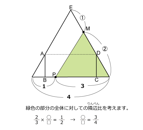 赤い四角形が全体の半分であることを利用して、等積変形で処理!
