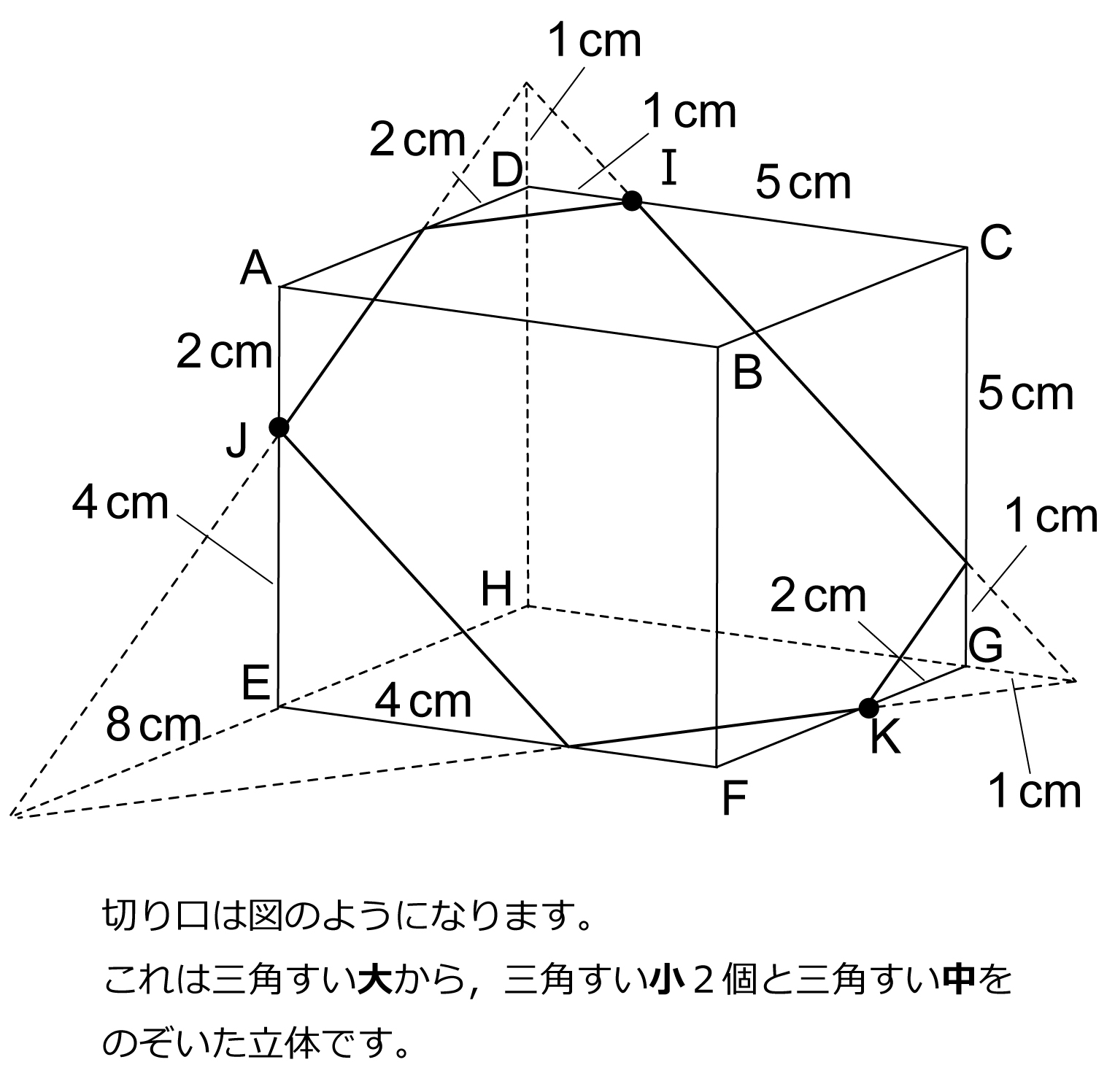 図のように,1辺の長さが6cmの立方体ABCD-EFGHがあります。点I,J,Kはそれぞれ辺CD,AE,FG上にあり,DI,AJ,GKの長さはそれぞれ1cm,2cm,2cmです。3点I,J,Kを通る平面でこの立方体を切ります。(1)切り分けた2つの立体のうち点Hを含む方の体積を求めなさい。