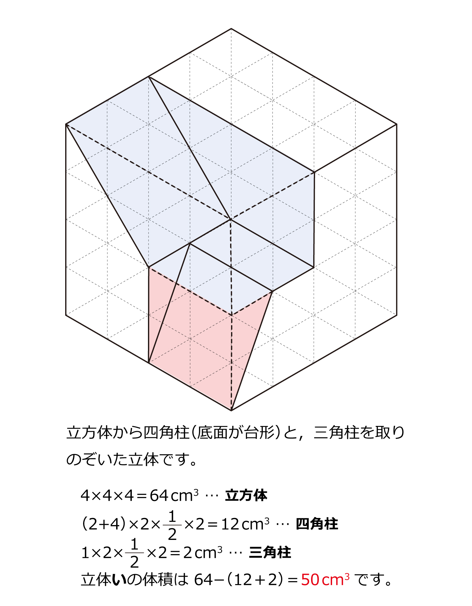 1辺の長さが4cmの立方体から,ある立体を切り取って残った部分を立体いとします。立体いは平らな面だけで囲まれています。図は立体いを正面,真上,真横から見た図です。 ただし,正面,真上,真横から見た図の1マスは1cmとします。このとき,立体いの体積を求めなさい。
