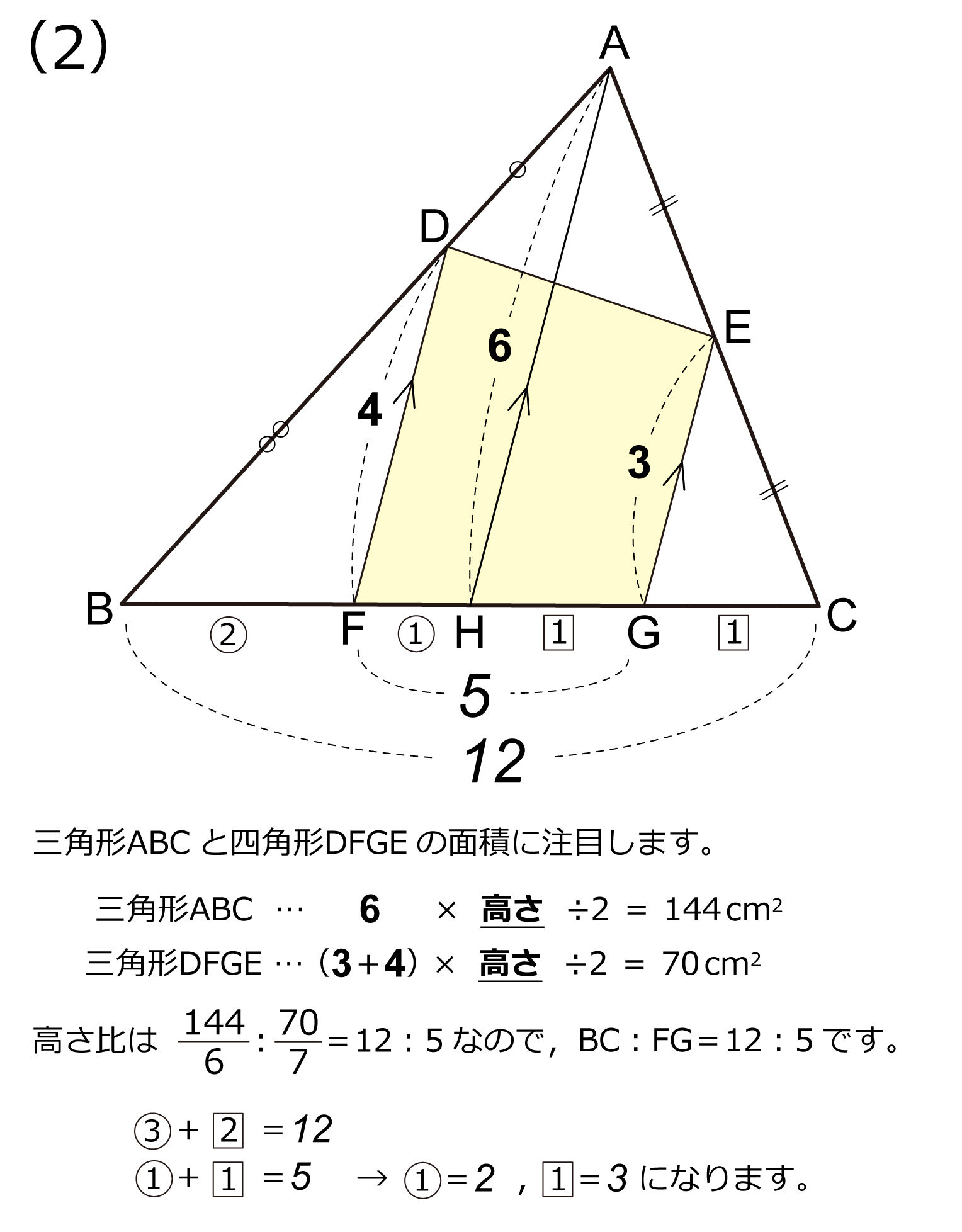 図のように,三角形ABCにおいて,辺AB上に点D,辺AC上に点Eを,辺BC上に点F,Gをとったところ,AD:DB=1:2,AE=ECとなり,直線DFと直線EGが平行になりました。三角形ABCの面積が144cm2,四角形DFGEの面積が70cm2であるとき,次の各問いに答えなさい。(1)DF:EGを求めなさい。