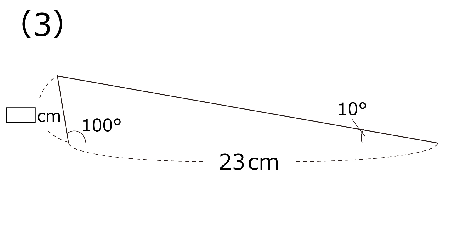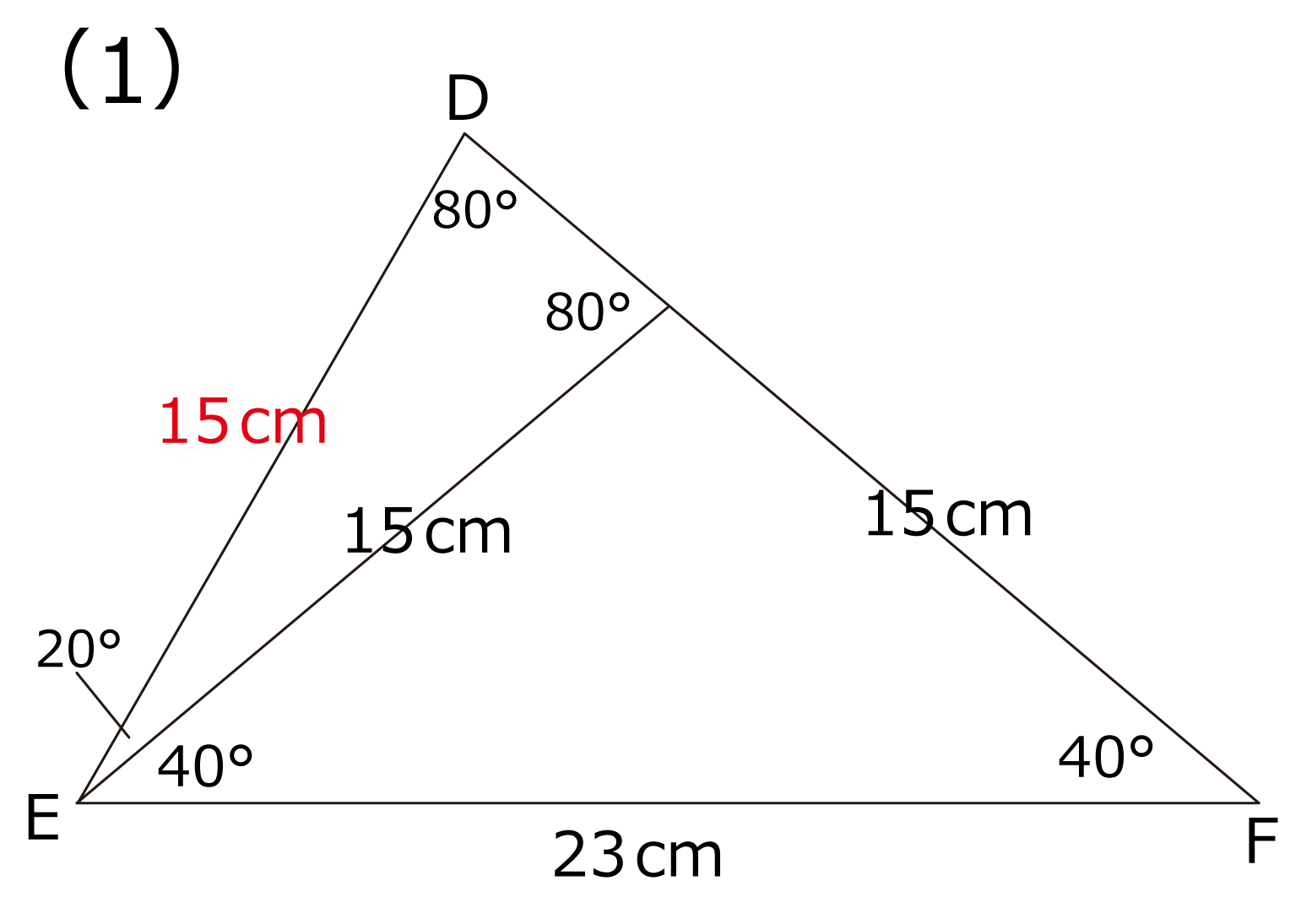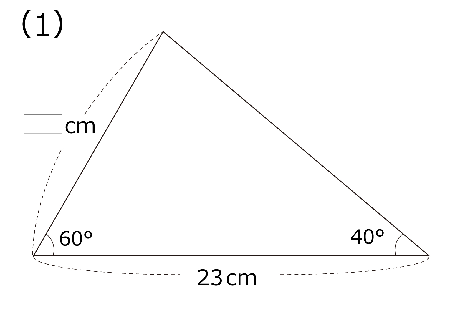 図のような二等辺三角形ABCがあります。辺ABと辺ACの長さは15cm,角Bと角Cの大きさは40度です。次の(1)(2)(3)の三角形で,□にあてはまる数をそれぞれ答えなさい。ただし,二等辺三角形ABCの辺BCの長さを23cmとして計算しなさい。解説