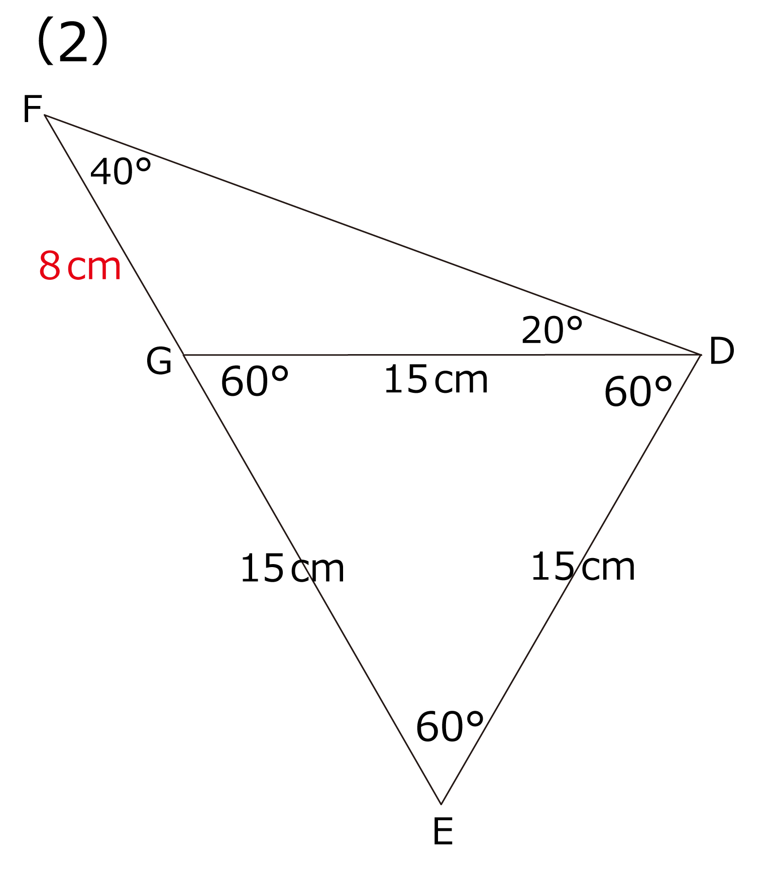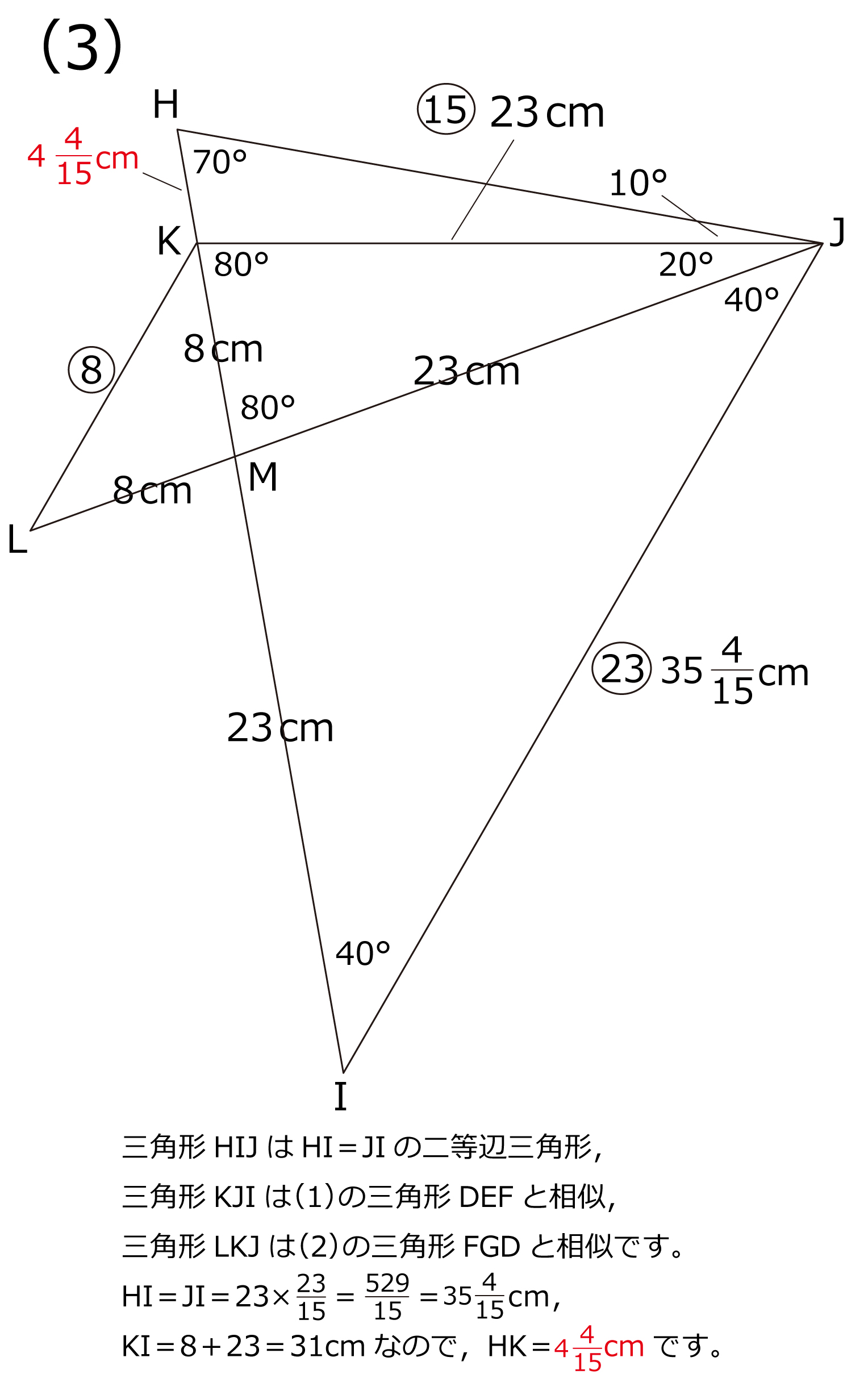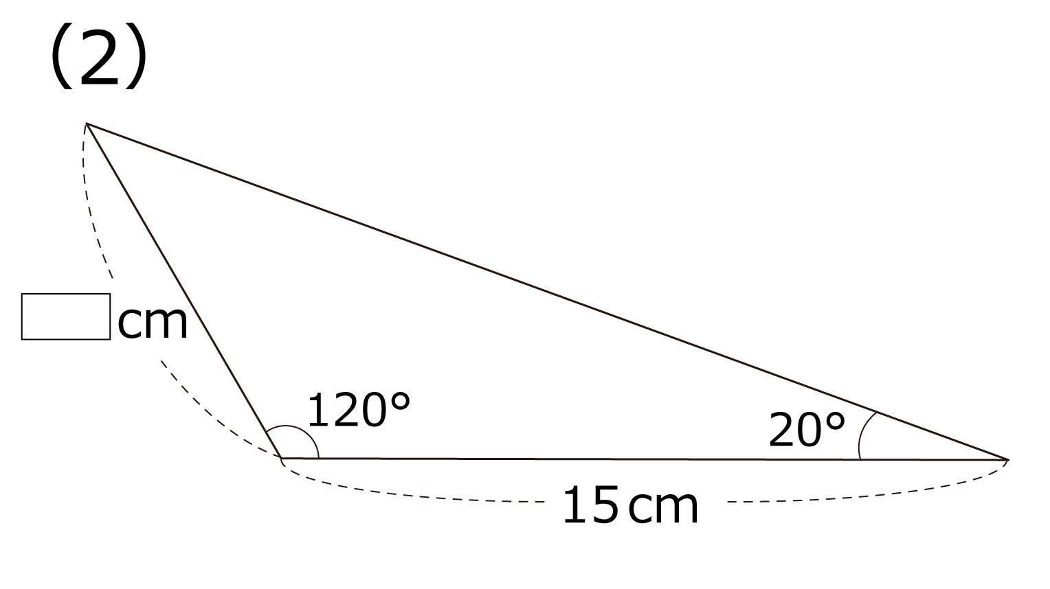 図のような二等辺三角形ABCがあります。辺ABと辺ACの長さは15cm,角Bと角Cの大きさは40度です。次の(1)(2)(3)の三角形で,□にあてはまる数をそれぞれ答えなさい。ただし,二等辺三角形ABCの辺BCの長さを23cmとして計算しなさい。解説