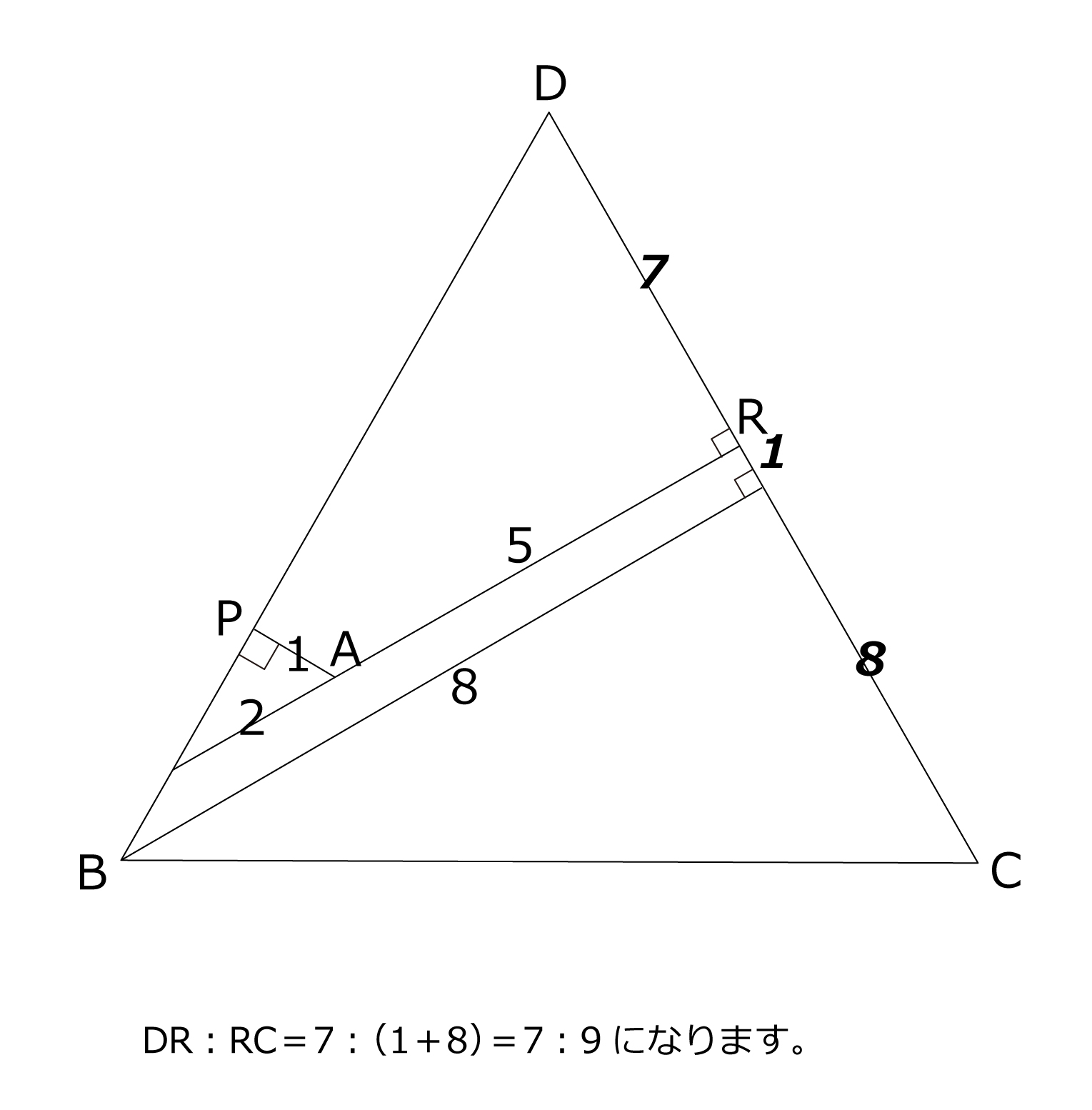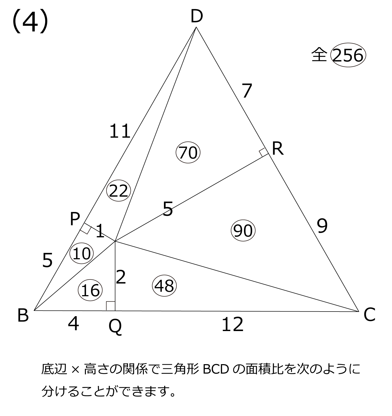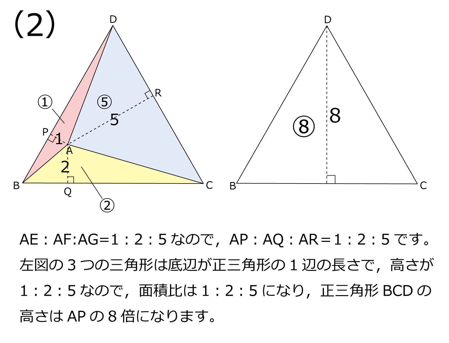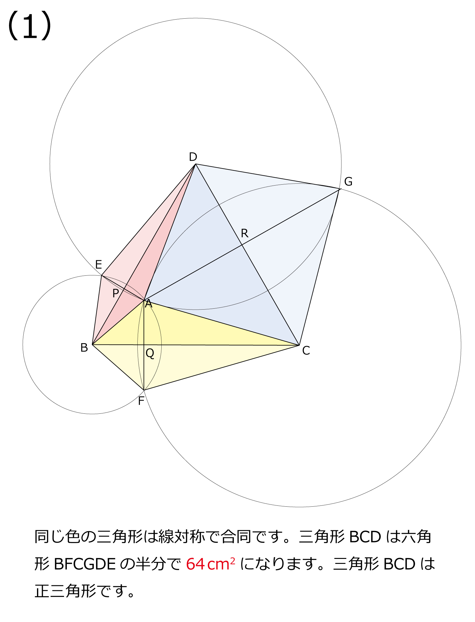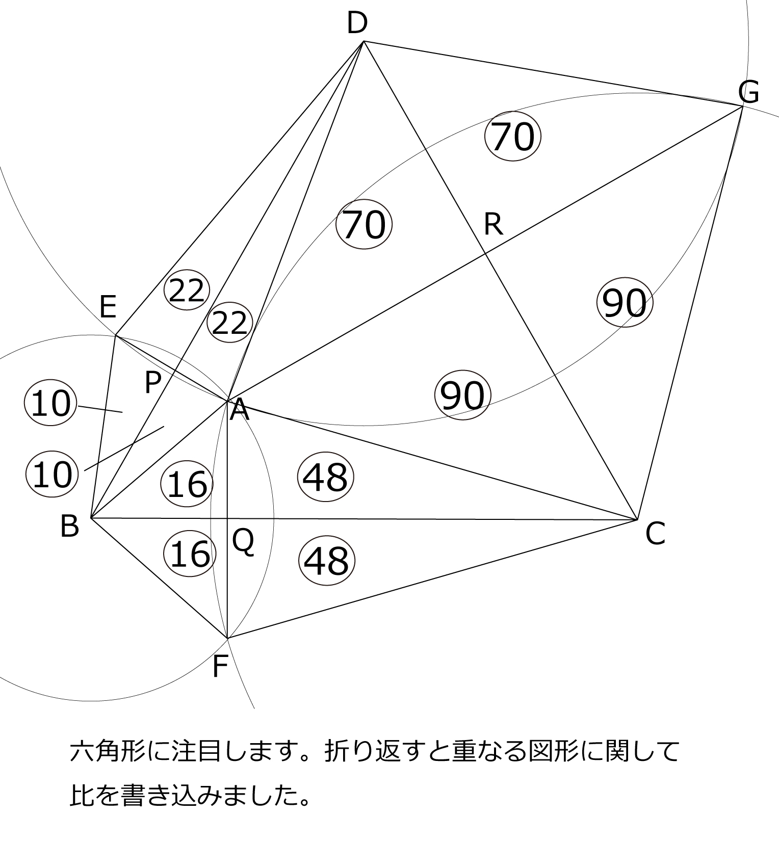 図のように,点B,C,Dを中心とする3つの円あ,い,うが点Aで交わっています。 点E,F,Gは2つの円の交わる点です。直線AEとBD,AFとBC,AGとCDの交点を それぞれP,Q,Rとします。また,・AE:AF:AG=1:2:5