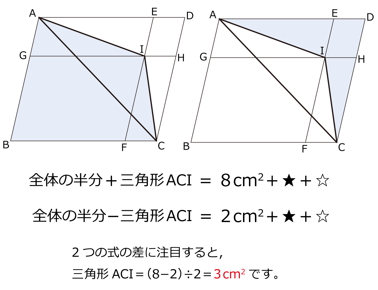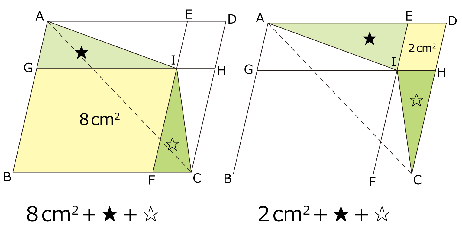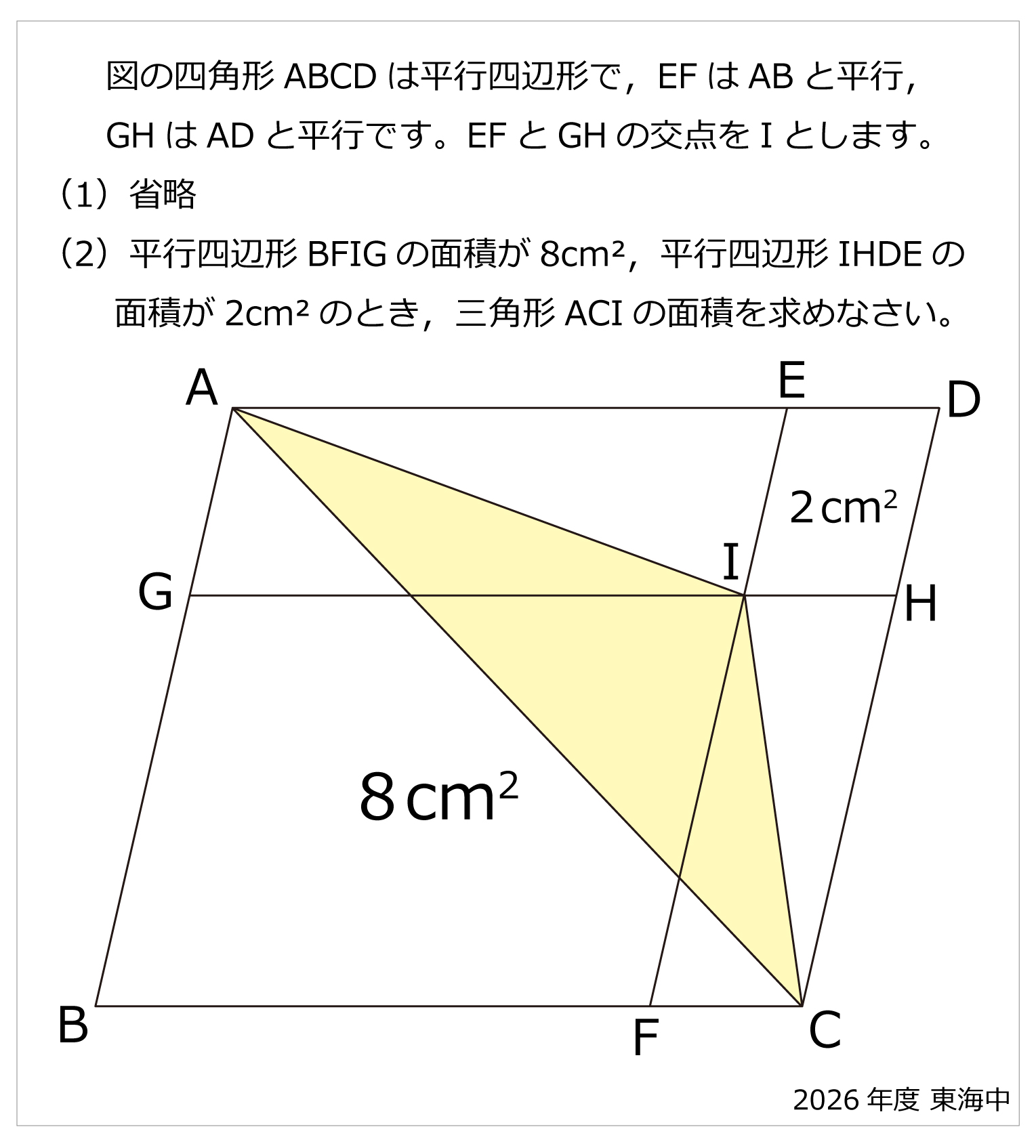(2)平行四辺形BFIGの面積が8cm²,平行四辺形IHDEの面積が2cm²のとき,三角形ACIの面積を求めなさい。