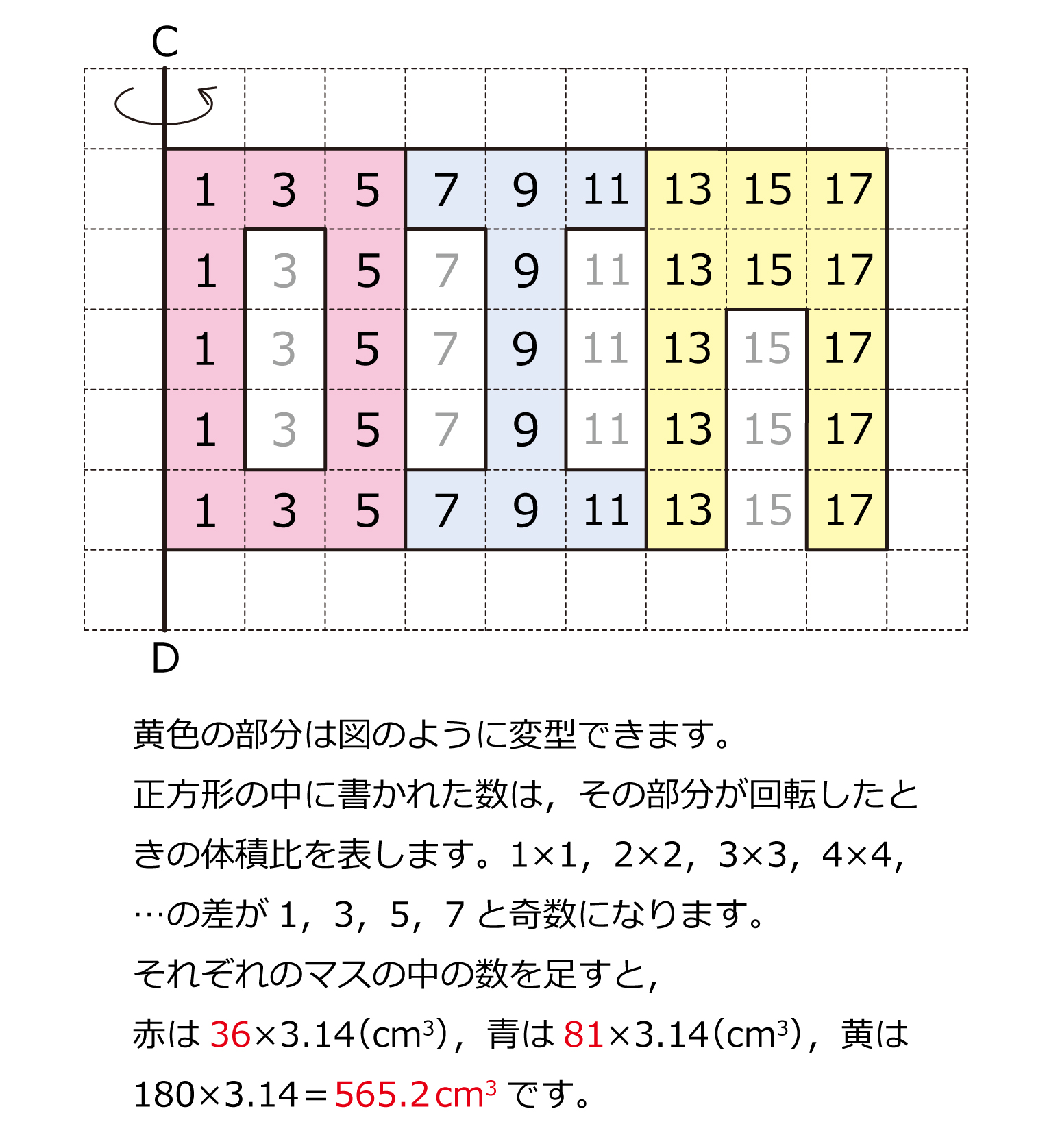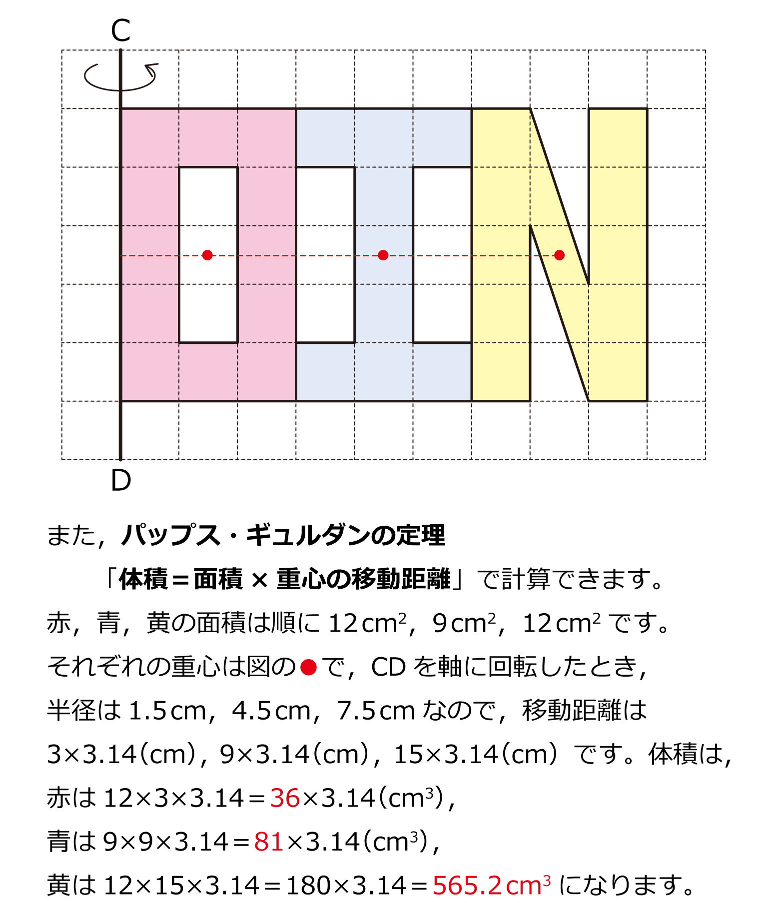 画用紙で図のような図形をつくり3色にぬりました。色のついていない部分は切り取ってあります。1目盛りは1cmです。この図形を直線CDを軸として1回転させてできる立体を考えます。このとき,赤色の部分がつくる立体の体積は[ア]×3.14 cm3,青色の部分がつくる立体の体積は[イ]×3.14 cm3,黄色の部分がつくる立体の体積は[ウ]cm3です。解説