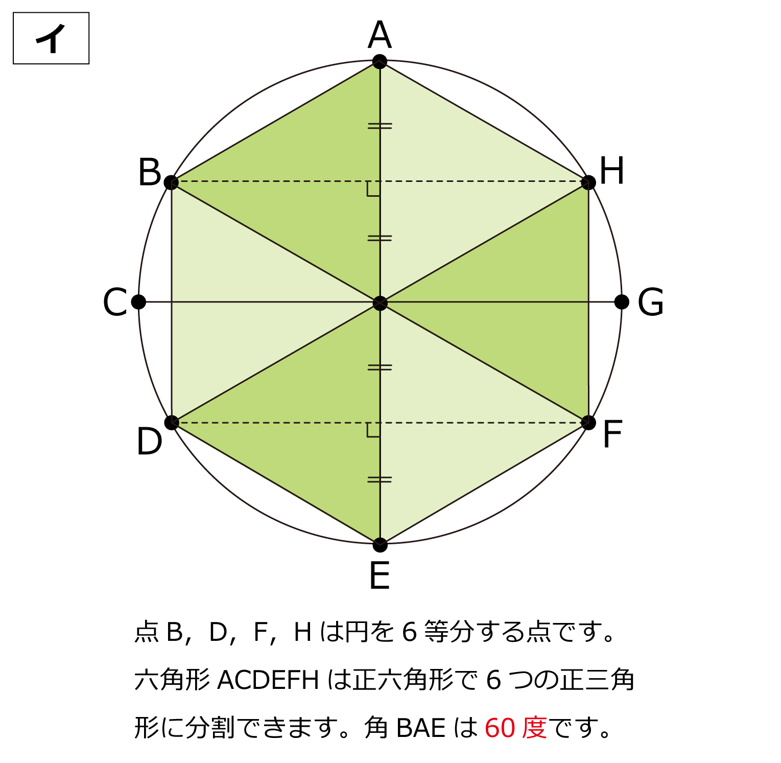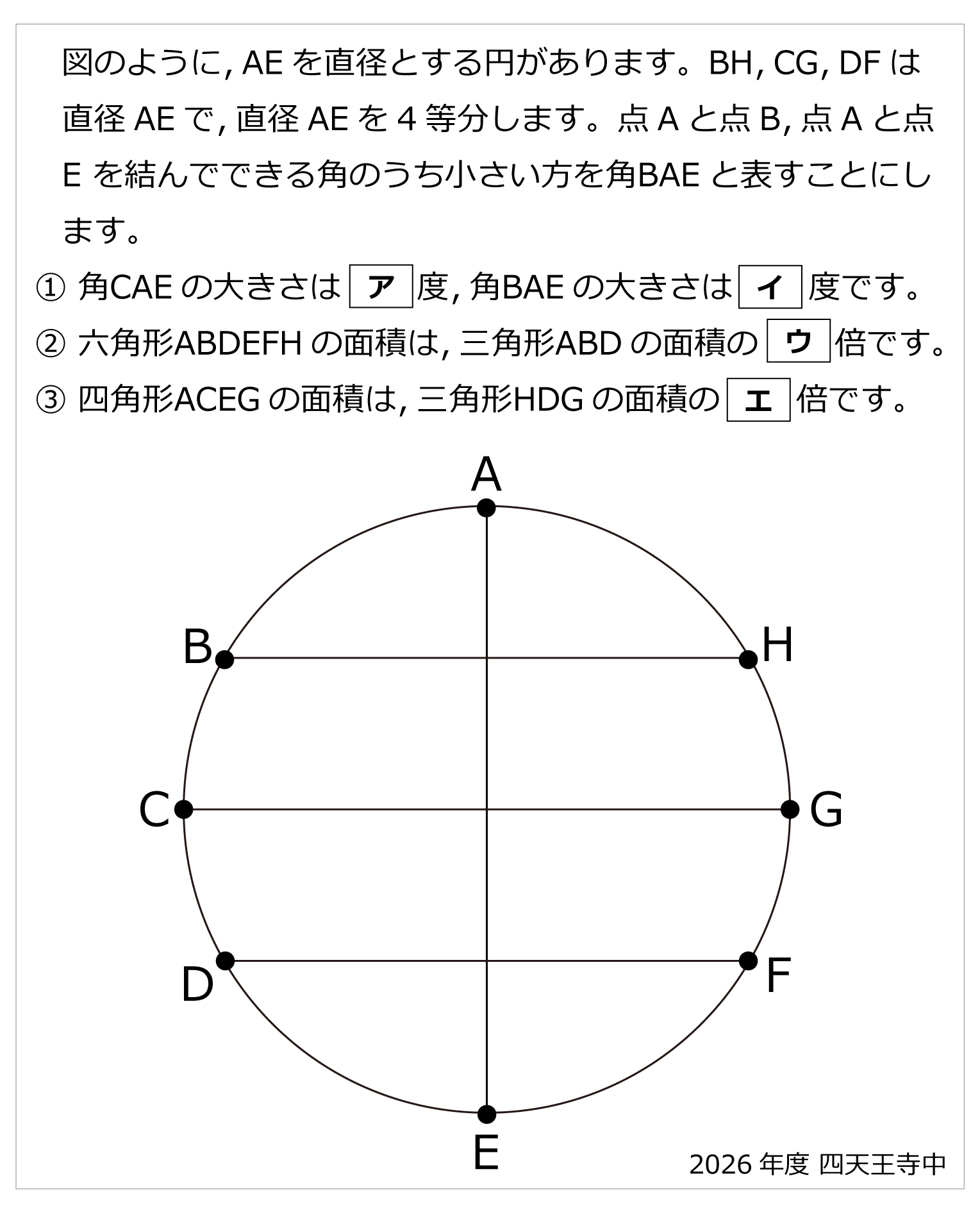図のように,AEを直径とする円があります。BH,CG,DFは直径AEで,直径AEを4等分します。点Aと点B,点Aと点E を結んでできる角のうち小さい方を角BAEと表すことにします。① 角CAEの大きさは[ア]度,角BAEの大きさは[イ]度です。