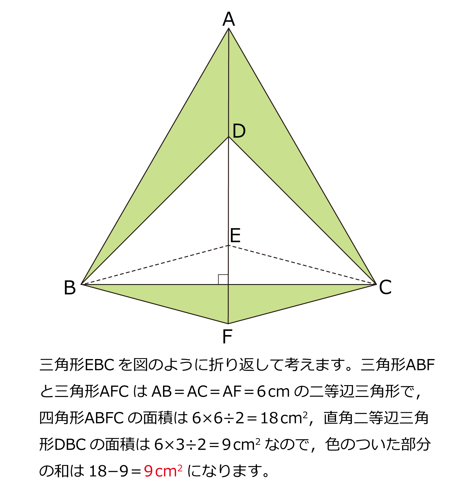 図のように一辺の長さが6cmの正三角形ABCの中に,角BDCの大きさが90度の直角二等辺三角形DBCと,角BECの大きさが150度の二等辺三角形EBCがあります。色のついた部分の面積の合計を求めなさい。解説