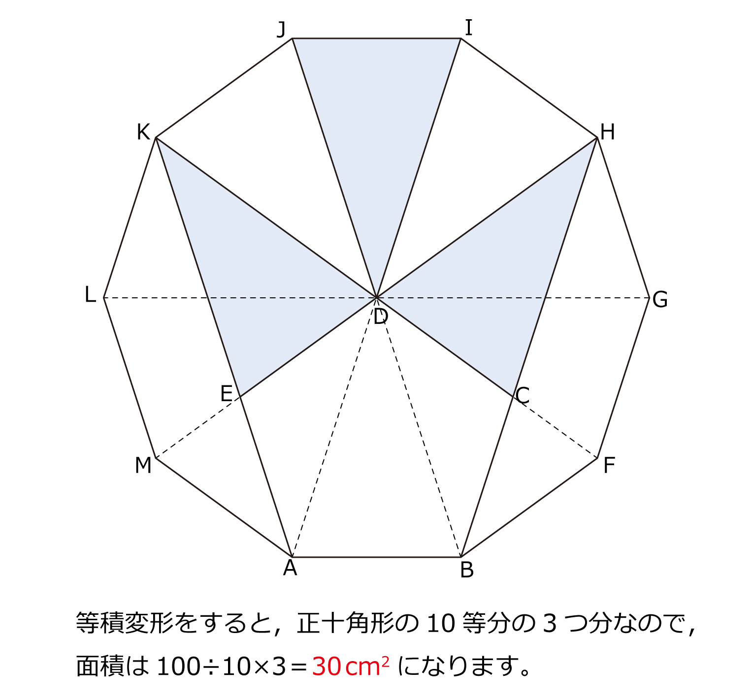 図で,五角形ABCDEは正五角形,十角形ABFGHIJKLMは正十角形です。正十角形ABFGHIJKLMの面積が100cm2のとき,色のついた部分(五角形CDEJI)の面積を求めなさい。解説
